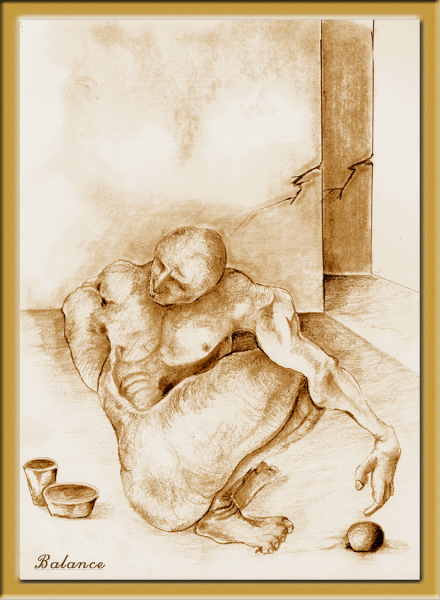 In “Balance”, a solitary figure stands in a posture of contained tension, suspended between stability and collapse. The elongated body bends and twists, grounded yet unsettled, as one arm reaches toward a small sphere just beyond grasp. The moment feels paused between intention and action.