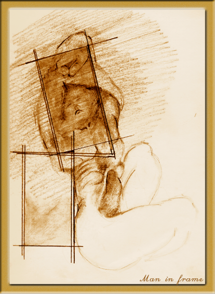 “Man in Frame”. A seated male figure curves inward, modeled with soft tonal transitions that emphasize vulnerability. A rigid rectangular frame encloses his head, interrupting the body’s organic flow.